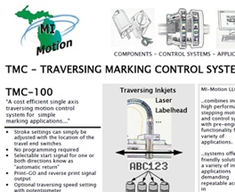 Tracking, date coding and barcodes require continuous ink jet and laser print capabilities. We work closely with ink jet manufacturers to supply the motion control that works with the print head required. We offer single and multi-dimensional Cartesian axes with integrated motor and controls. The results are less wiring, smaller E-cabinets and fewer spare parts. The benefit to you is one source for a complete system, either standard or customized. These are the industries that our product is currently working within.